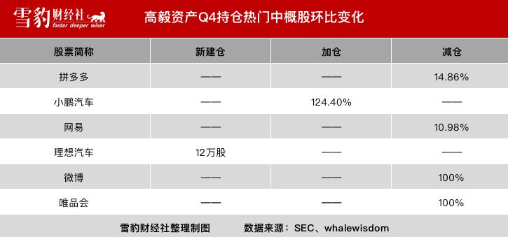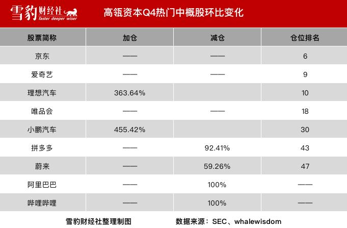 以持仓中概股闻名的高瓴资本,Q4通过旗下对冲基金HHLR Advisor持仓76只美股,持仓总市值为64.72亿美元,环比下滑15.35%。