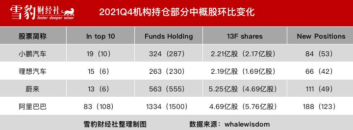 2021年Q4,机构进一步加仓小鹏汽车、理想汽车、蔚来等新造车势力。