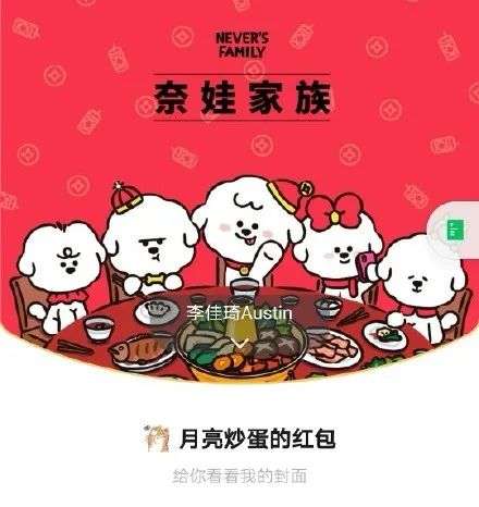 今年年初以领取李佳琦红包和奈娃家族红包的方式,吸引用户以拆盲盒的形式抢红包封面。奈娃家族是李佳琦为自己养的几只宠物狗,建立的IP。在天猫有奈娃家族旗舰店,在微信有奈娃家族公众号。