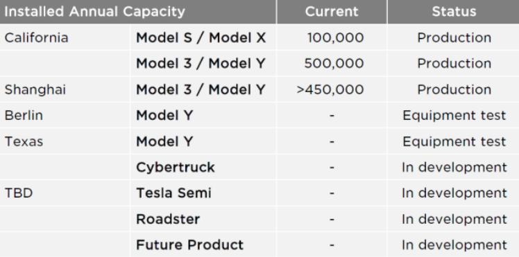 特斯拉目前所生产的汽车主要来自于美国加州弗里蒙特和中国上海两地的超级工厂(GIGafactory),其中弗里蒙特工厂最早由特斯拉在 2010 年从丰田集团子公司收购并大规模升级改建,并于 2012 年产出第一台 Model S,经过多次扩建后,弗里蒙特工厂目前的年规划产量在 50 万台左右。