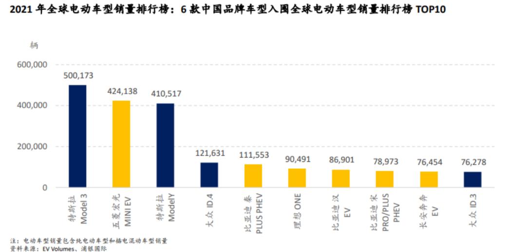2019 年发布的 Model Y 迅速成为特斯拉的又一款「杀手级」产品, 特斯拉的全球销量也在不断刷新纪录,根据 EV Volumes 公布的 2021 年全球电动车型销量排行榜 Top10 数据,2021 年特斯拉 Model 3. Model Y 分别以 50 万和 41 万的绝对优势位居排行榜第一和第三,在第四名的大众 ID 4 销量仅有 12 万出头。考虑到榜眼的五菱宏光 MINI EV 在定价和目标客群上都不与特斯拉产生竞争,特斯拉全球第一电动车企的地位无可撼动。
