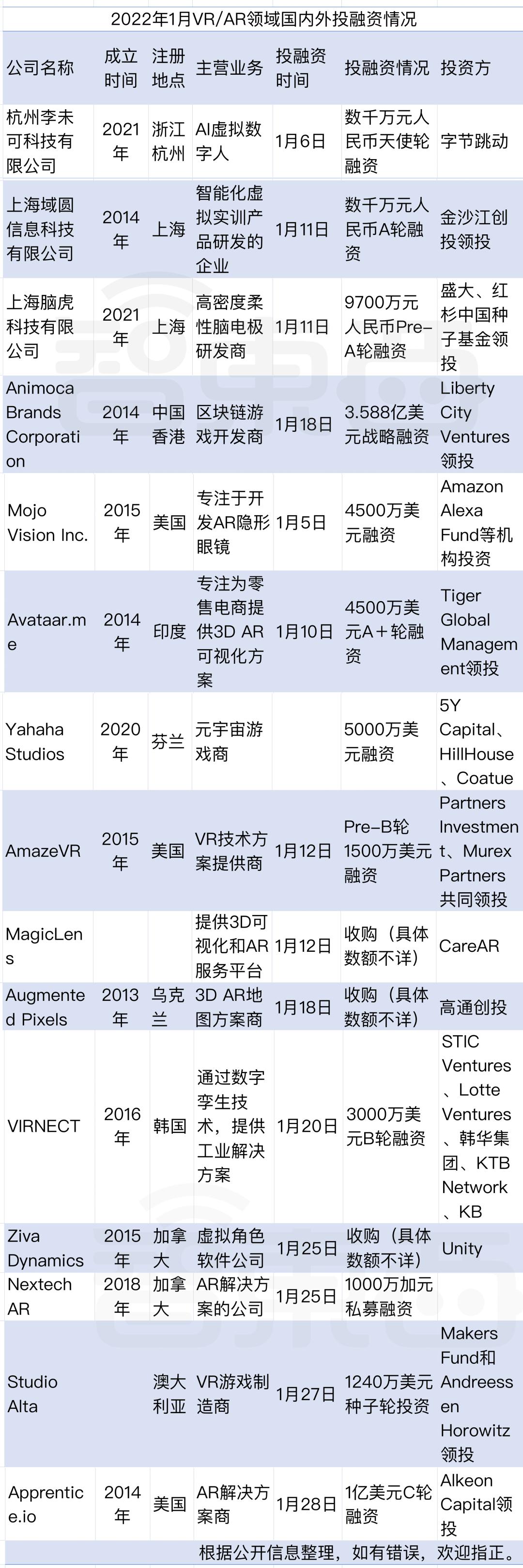 一些中小型企业也正乘势而起。据统计,今年1月国内外XR行业共完成15笔融资并购,国内4笔,国外11笔,总金额约为7亿6105万美元。