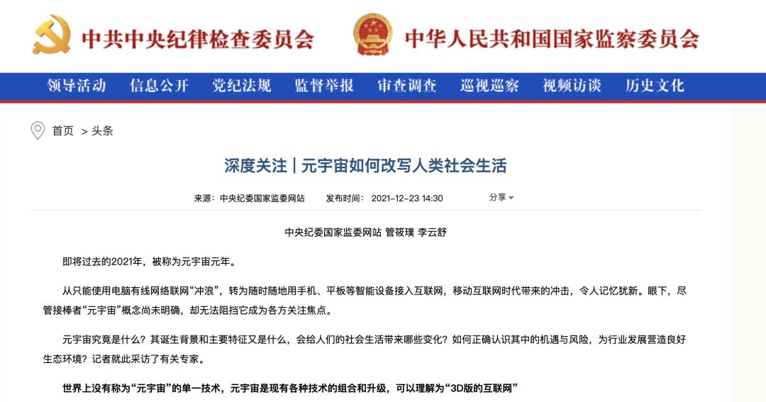 中央纪委网站发布的《元宇宙如何改写人类社会生活》提及“元宇宙”中可能会涉及资本操纵、舆论吹捧、经济风险等多项风险。就连春晚的小品中,“元宇宙”也成为“瞎忽悠”的代名词。