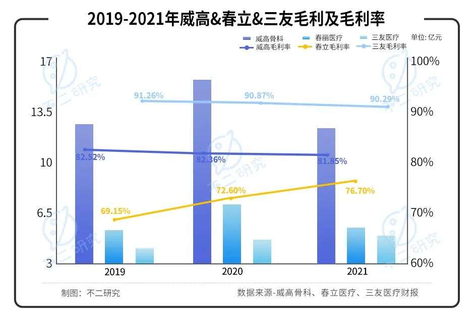 「不二研究」认为,不同的业务布局和业绩规模直接影响了各公司的盈利能力。威高骨科、春立医疗、三友医疗的毛利率有一定的差距。据各家财报显示,威高骨科2019年、2020年、2021年前三季度毛利率为别为82.52%,82.36%,81.85%;同期,春立医疗的毛利率为69.15%,72.60%,76.70%;三友医疗的毛利率为91.26%,90.87%,90.29%。
