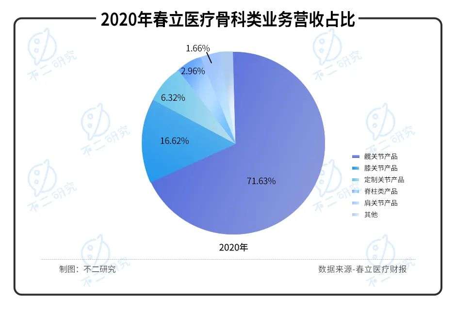 春立医疗则主要布局关节类产品。据其财报显示,2020年春立医疗关节类产品占其收入比例为96.23%,其中,髋关节产品占比71.63%,膝关节产品占比16.62%,定制关节产品占比为6.32%,肩关节产品占比为1.66%。另外,春立医疗还有少量脊柱类产品,2021年上半年取得营收占比为2.96%。