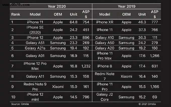 但别忘了,iPhone SE系列的目标地区不止是中国大陆,它在国外的销量远超我们的想象。以Omdia公布的2020年全球手机单品榜单中,iPhone SE 2的销量仅次于iPhone 11,是全球第二畅销的机型。哪怕到了2021年,它依旧能跻身前十,销量也早已突破两千万大关。