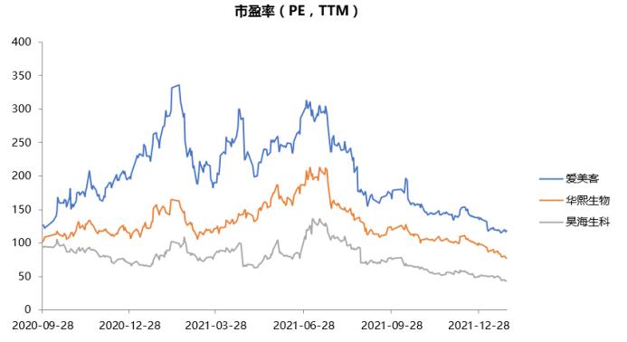 当颜值经济大行其道,医美自然是大热门,而作为“女人的茅台”的玻尿酸龙头爱美客,自2020年9月上市后,股价就一路飙升,仅用了不到一年时间,市值水平就实现了超三倍的跃迁,站上了1700亿元历史高点,之后则是一路下跌,调整至今。但相较于“医美三剑客”另外两家华熙生物和昊海生科,爱美客的估值在回调后还是高出了一大截。