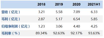 目前,爱美客主营各类透明质酸钠(玻尿酸)产品,包括皮肤填充剂、面部埋植线产品、衍生的化妆品等。根据2021年中报的数据,爱美客靠销售上述产品,实现营业收入6.33亿元,同比增长161.87%;同期实现净利润4.25亿元,同比增长195.42%。