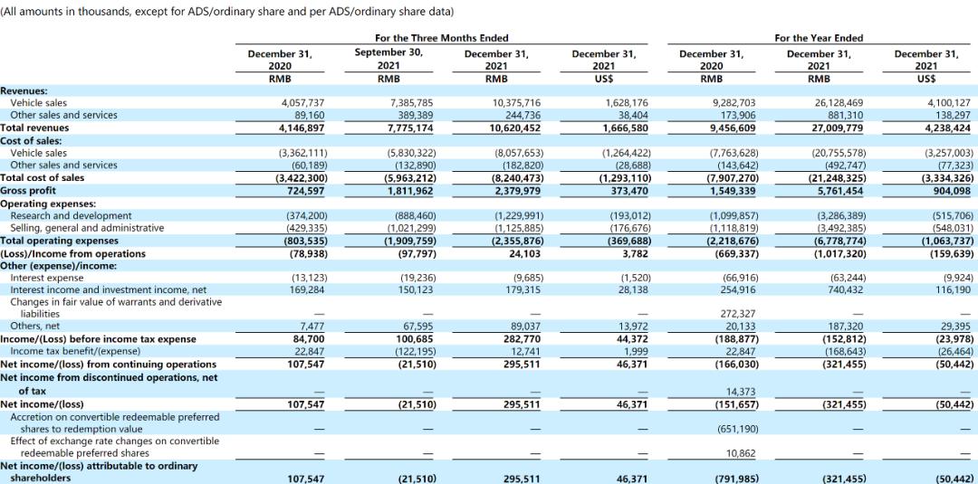 财报数据显示,理想汽车2021年第四季度实现营收106.2亿元,交付35221辆,季度营收首次突破百亿;2021年全年实现营收270.1亿元,同比增加185.6%。净利润方面,第四季度的净利润为1.075亿元,2021年的净亏损为3.215亿元,同比增加111.9%。