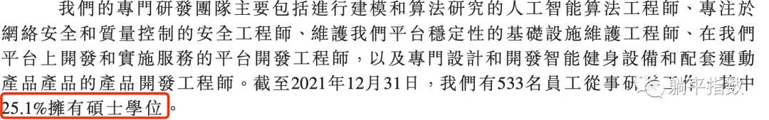 据招股书,Keep公司大概有超过1100名员工,其中533名从事研发工作,如下图所示,有25.1%拥有硕士学位,约144名。