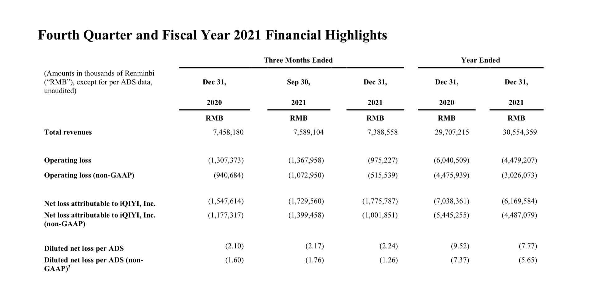 业绩快报 | 爱奇艺Q4运营亏损收窄,目标实现2022年运营盈亏平衡