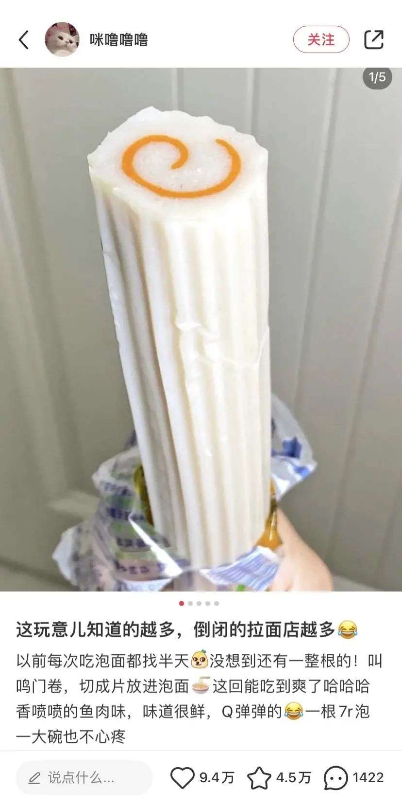 发个吃拉面必备的鸣门卷,首图就是手持剥开包装袋的食物,没有华丽的滤镜和花字加持,也爆了。