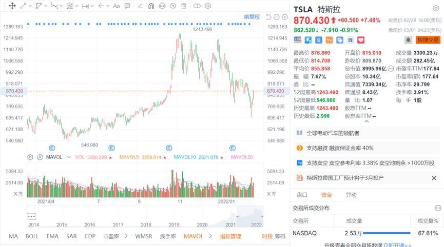 要知道在这个投票尚未截止,抛售也没有详细计划出炉之时,特斯拉的股价就开始山崩了,2021年11月8日和11月9日两天,特斯拉股价暴跌16.25%。而在埃隆·马斯克发起投票的前一天,2021年11月5日,特斯拉的股票创下了历史新高1243.49美元。