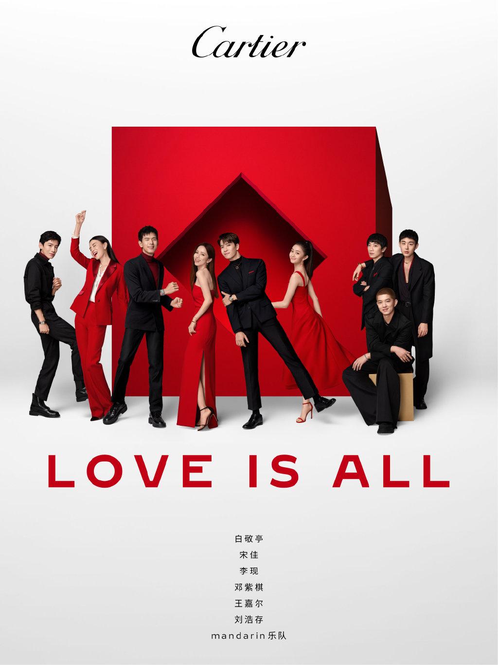 同样选择合作多位明星拍摄TVC的还有Cartier(卡地亚)。2022年伊始,卡地亚携手品牌挚友王嘉尔、李现、刘浩存、邓紫棋、白敬亭以及 mandarin 乐队、宋佳,用《LOVE IS ALL》这一经典歌曲演绎爱与欢聚的动人主题。与此同时,品牌邀请众星进入天猫卡地亚官方旗舰店进行直播。据统计,1月6日晚卡地亚天猫超级品牌日全明星直播观看量突破110万。