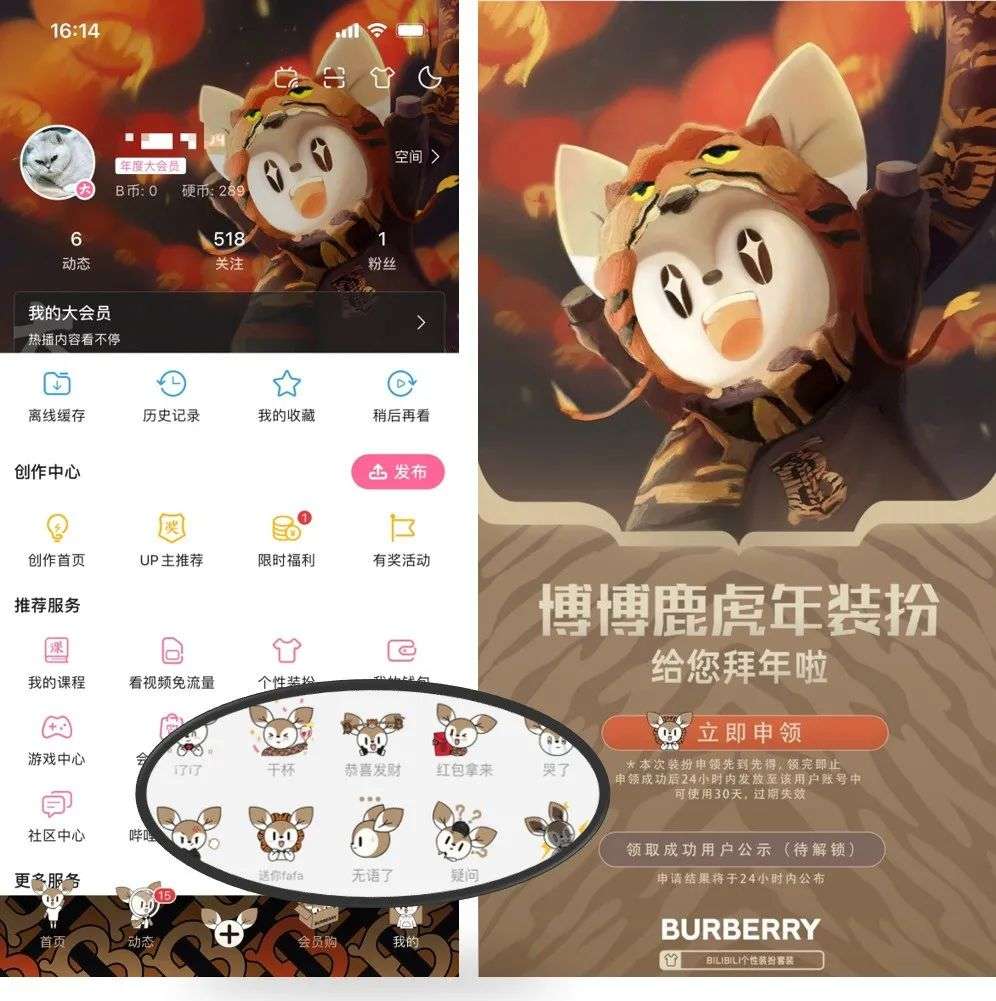 虎年到来之际,Burberry在B站推出了以品牌首席卖萌官“博博鹿”为主题形象的定制系列装扮,包括博博鹿虎年限定皮肤、个性页面头图、专属表情包等装扮一上线即被申领一空。
