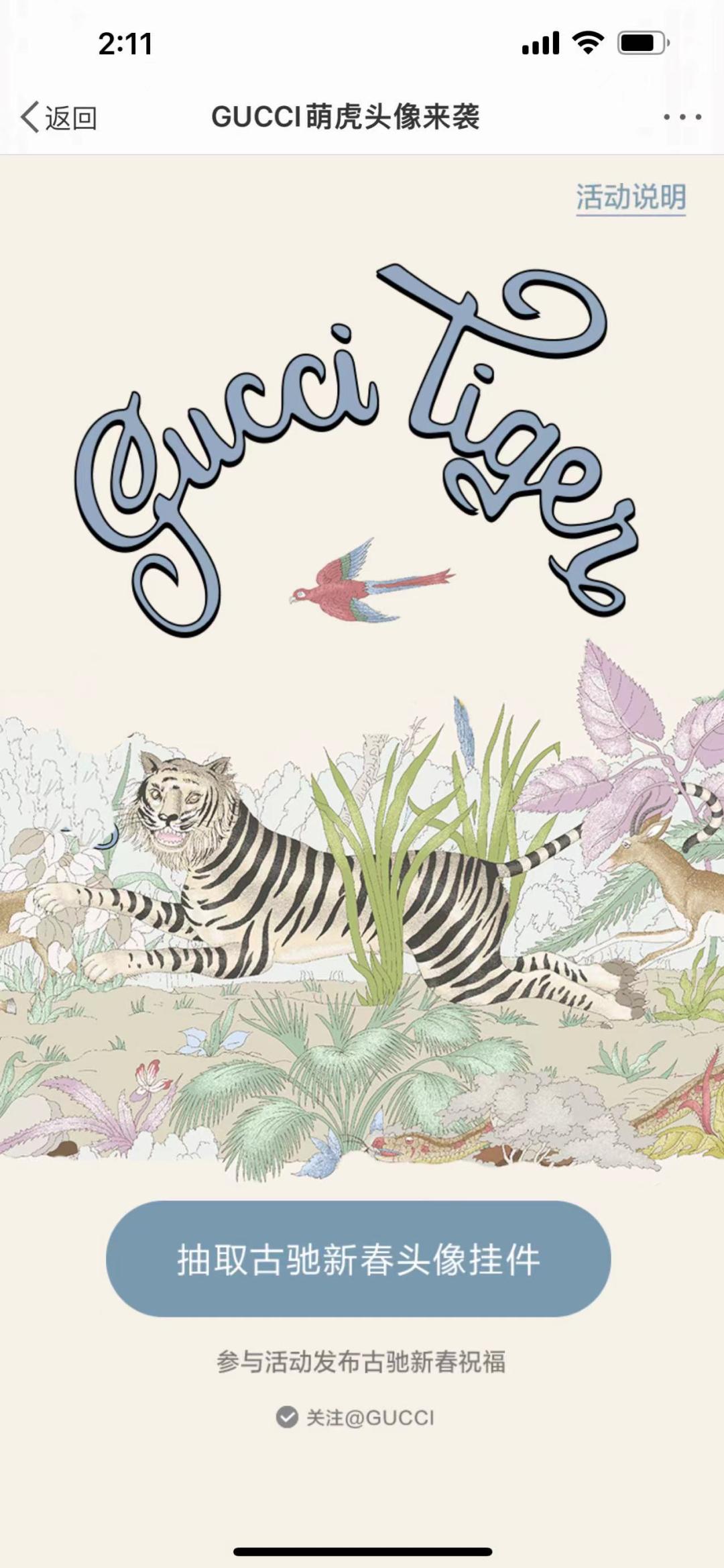Gucci则在不同平台上同步发起互动。抖音发起#guccitiger 品牌挑战,邀请用户使用带有Gucci新年系列老虎及花卉图案的滤镜拍摄短视频,话题内品牌宣传视频五天获得3.3亿次观看。在微博话题#萌虎头像来袭#内,Gucci则开展了抽取新春头像挂件活动。