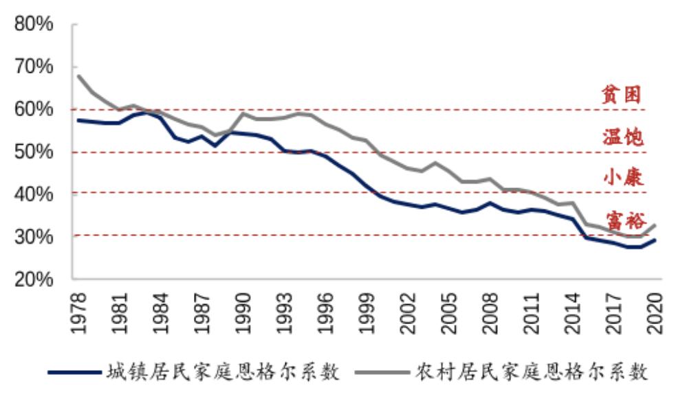 可以看到,无论是城市居民还是农村居民的恩格尔系数都在逐年走低,同时我们离发达国家10%-20%的恩格尔系数还有进一步下降的空间。