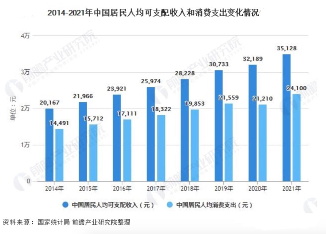 其次,我们来看另一个数据——中国人均可支配收入和中国人均消费支出。