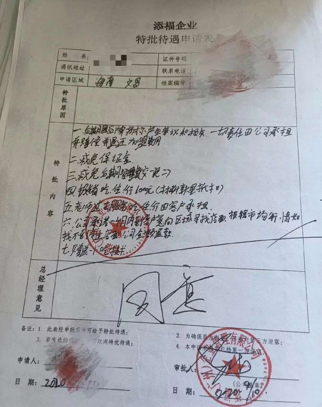 我去他们公司考察的时候,对方让我先交一笔44800元的加盟费和设备费,还说这个是活动优惠价格,而这项优惠活动又正好截止到当天。对方给我的《特批待遇申请表》上承诺,如果一个月内在我意向地区找不到合适的店面,会全额退款。