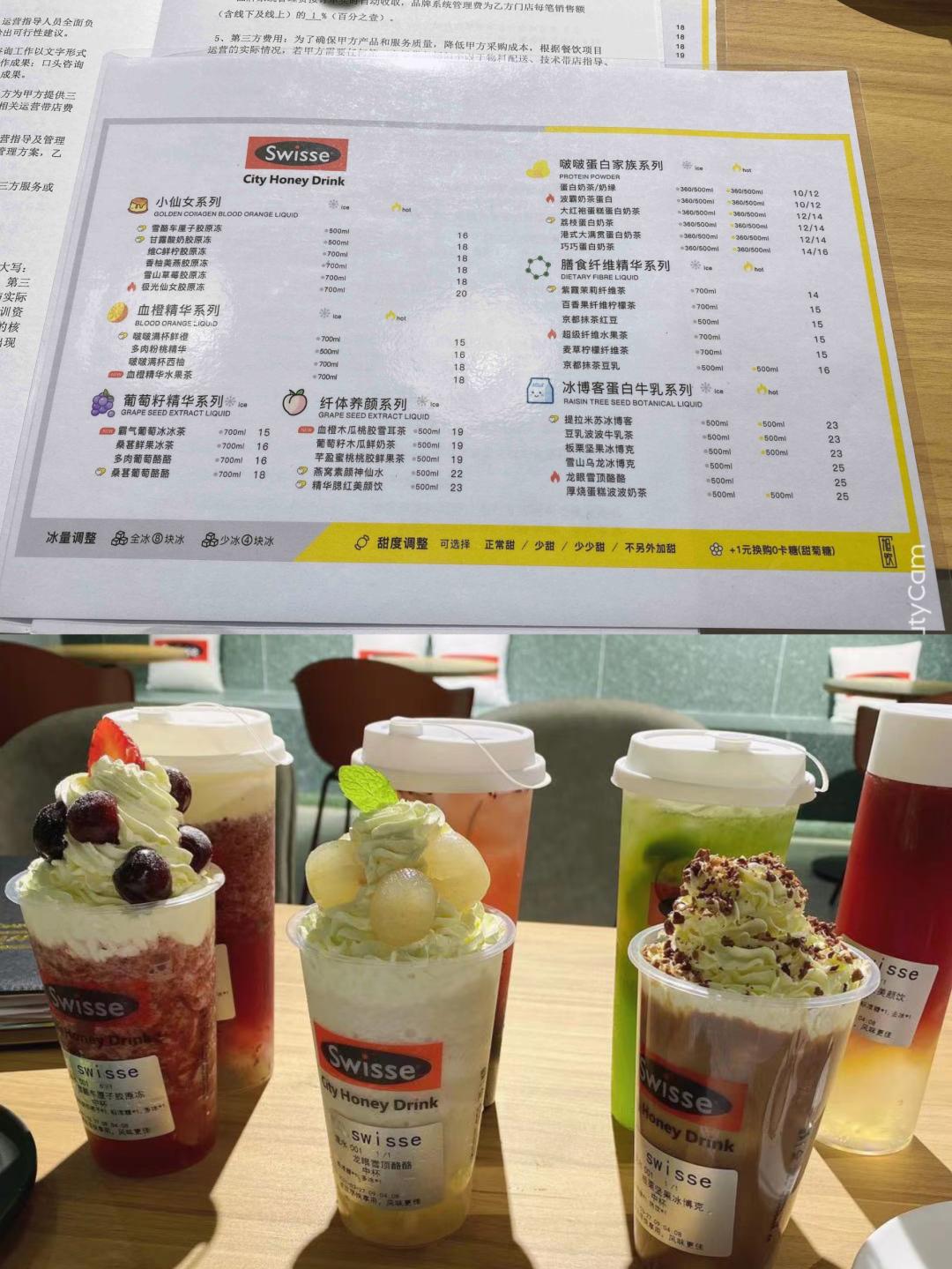 这家负责招商的公司叫“旭饮”,我专门从家去了一趟他们位于上海青浦的公司总部。我去的时候,有不少同样有加盟意向的人在参观。公司摆出的奶茶和甜品的样品,都贴有Swisse品牌商标;菜单也是按照Swisse的大热品类设计的,比如葡萄籽精华系列、血橙精华系列等,单价在20元左右。看到这些,我心里就没有对品牌授权问题产生怀疑。