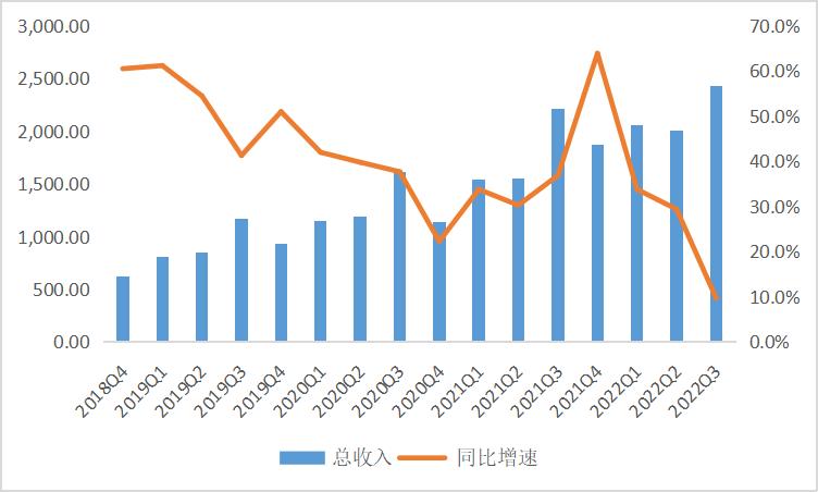 图1:阿里巴巴总收入(亿元)和同比增速 % 数据来源:wind、36氪整理