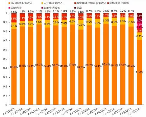 图5:阿里巴巴各项业务占比 数据来源:天风证券、36氪整理