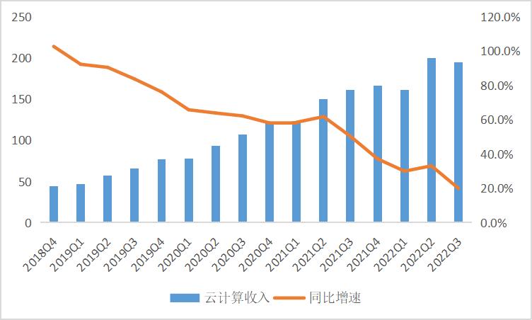 图3:阿里巴巴云计算收入(亿元)和同比增速 数据来源:wind、36氪整理