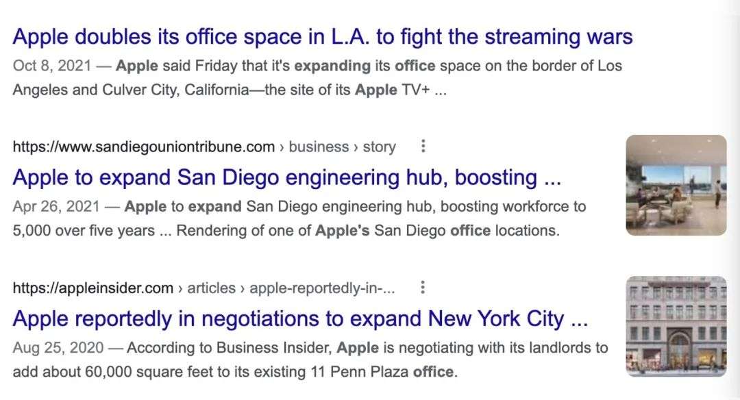 苹果在2020年在纽约市的办公室面积只有约5万2平方英尺,但是截至去年年底,苹果在纽约市的办公空间就扩大了6倍。而过去两年,苹果还表示将在北卡罗来纳州罗利附近建立一个园区,并在圣地亚哥、洛杉矶、硅谷等地大幅扩大办公空间。