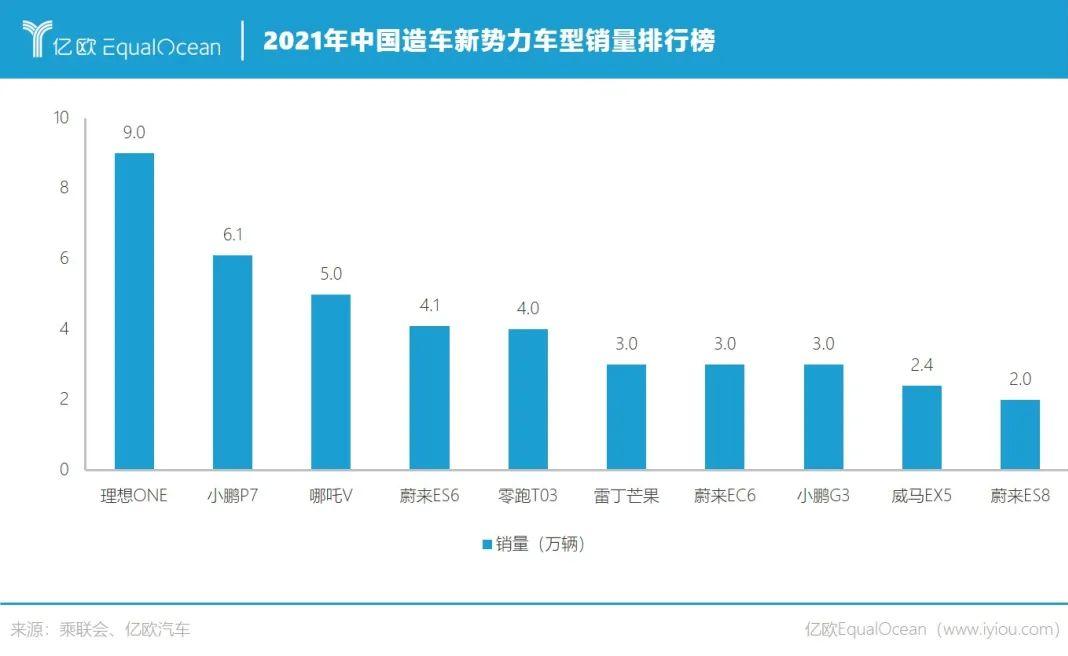 乘联会数据显示,2021年中国造车新势力车型销量排名中,理想ONE和小鹏P7名列前二,哪吒V、零跑T03和威马EX5销量位居前十。