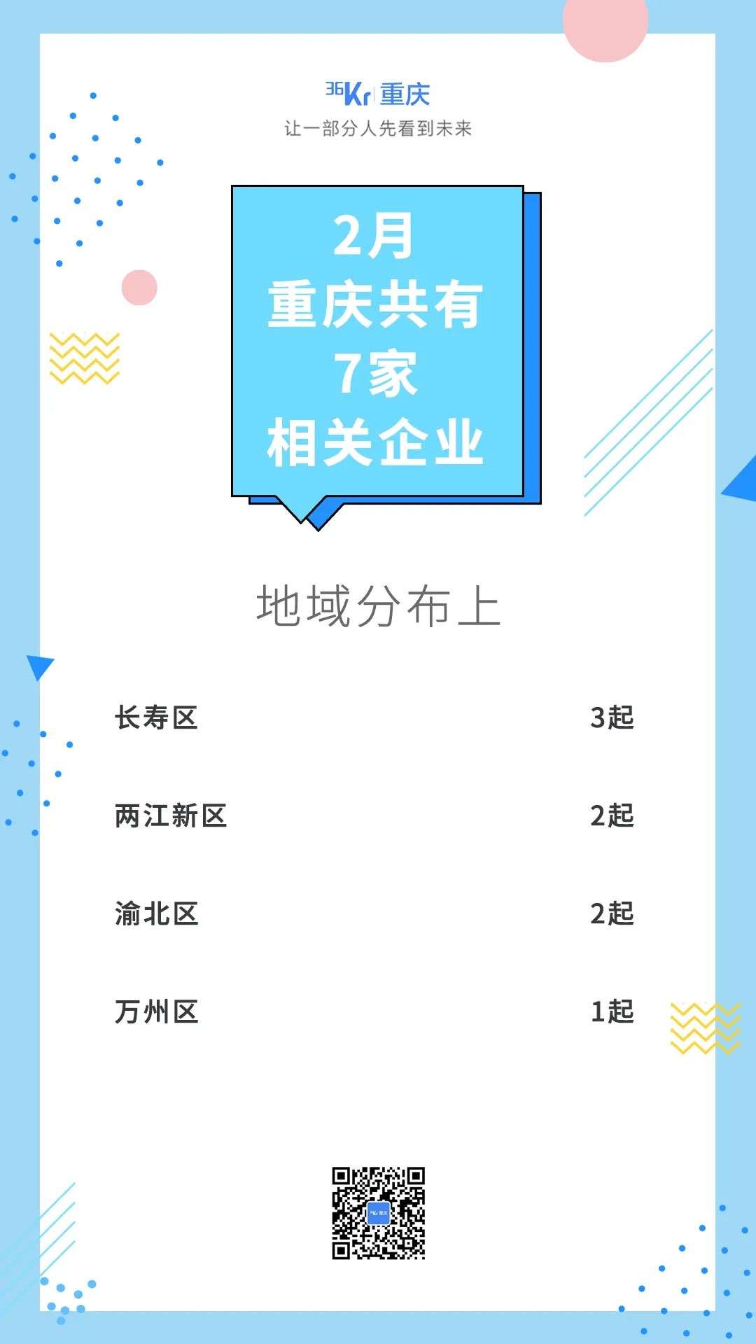 从所在地来看,2月长寿区共获得3起融资,两江新区、渝北区各2起,万州区1起。