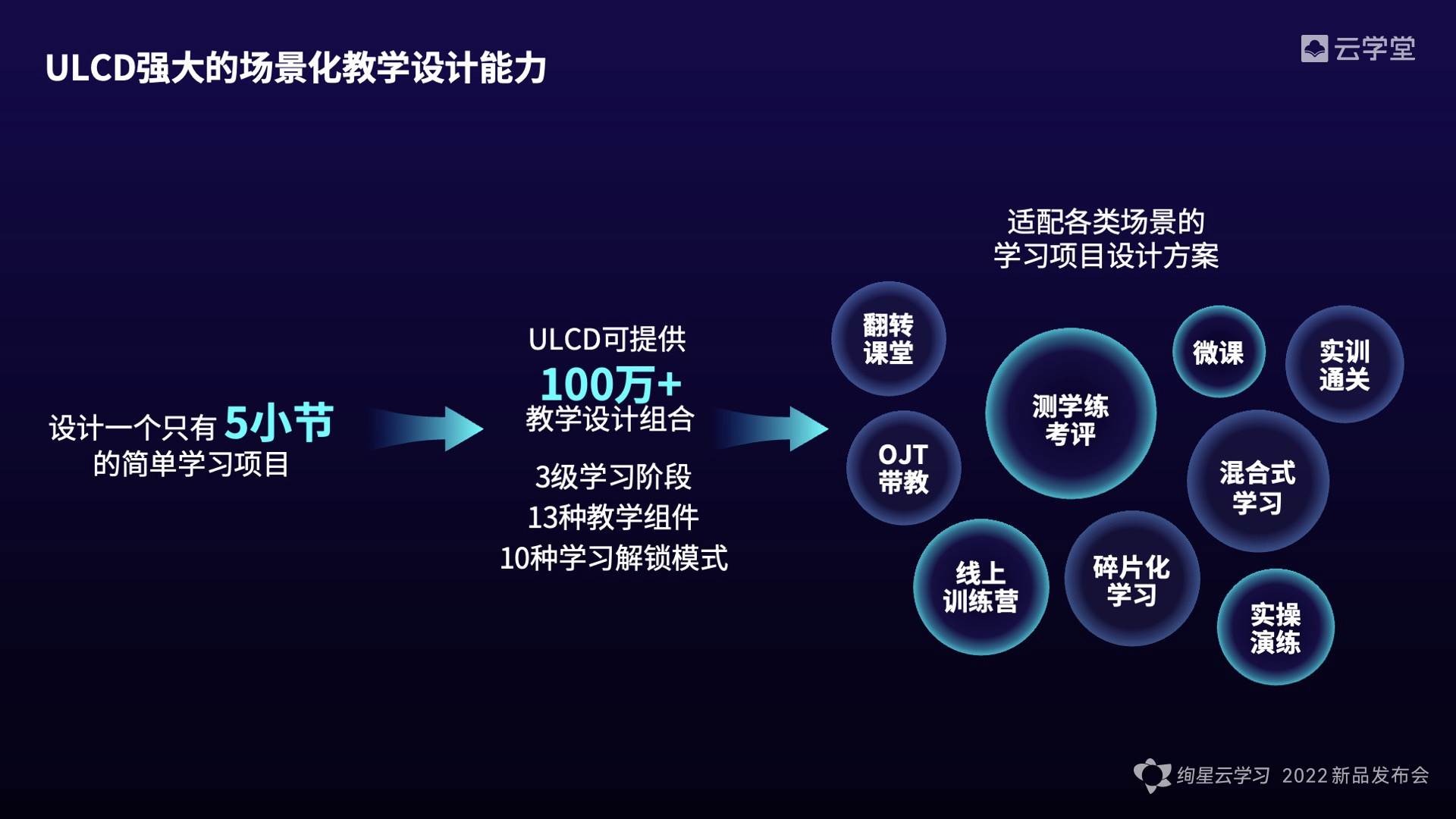 这是对客户需求的精准洞察。不过,要满足客户的需求,海量的数据支持只是一个开始。还要具备强大的算法,更强的人工智能能力。云学堂研发的“通用学习内容设计器”(ULCD),能通过设计组合能够支撑100多万种学习场景。