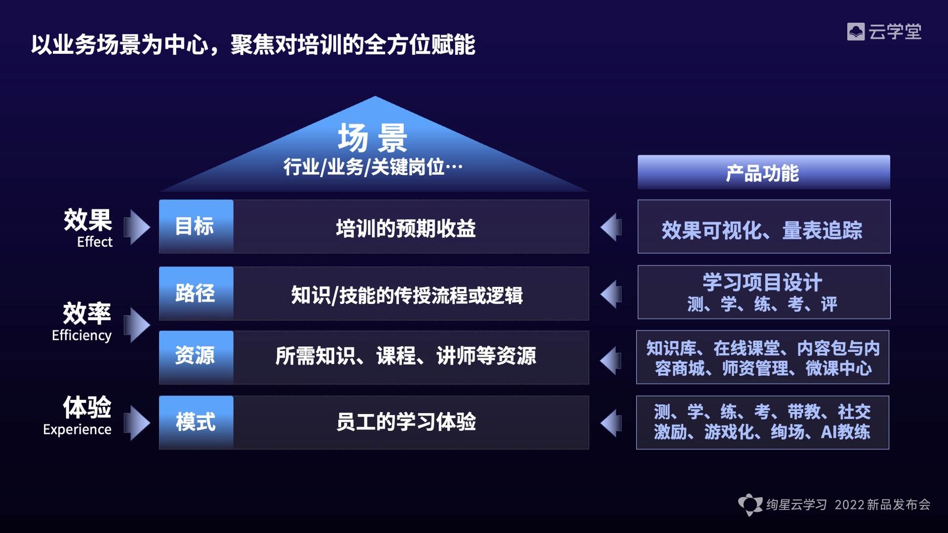 举例而言,“绚星云学习”产品其实并非云学堂产品的全部。它只是三位一体的企业学习解决方案中的软件部分,同时也是业务的基础设施。