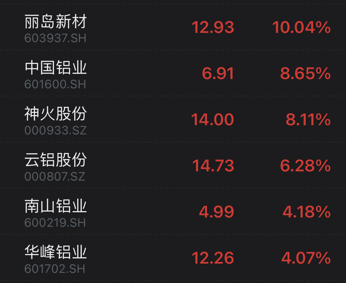 隔夜伦铝再度刷新收盘历史高位,带动A股铝业股走高,丽岛新材、宁波富邦涨停,中国铝业、神火股份涨超8%,云铝股份涨超6%。