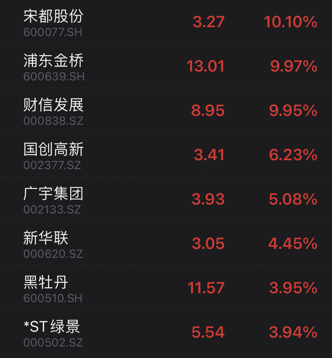 地产股走强,宋都股份、浦东金桥、财信发展涨停,国创高新、新华联、广宇集团、黑牡丹等涨幅居前。