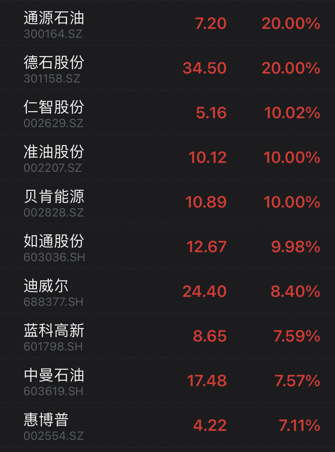 油气股开盘大涨,通源石油、准油股份、胜利股份、如通股份一字涨停,德石股份、贝肯能源、迪威尔、中曼石油等涨幅居前。与此同时,石化股集体下挫,恒力石化、荣盛石化跳水闪崩跌超7%。