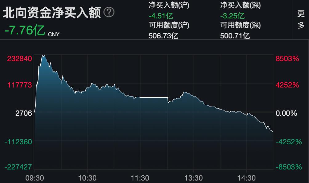 A股三大指数今日集体收跌,沪指跌0.13%,深成指跌1.05%,创业板指跌1.77%;北向资金净流出7.76亿元,早盘一度净买入超23亿元。