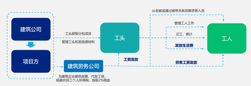 在如下图的独特劳务人员共享+灵活用工模式下,呈现工人管理难、工资发放乱、项目进展慢的特点。