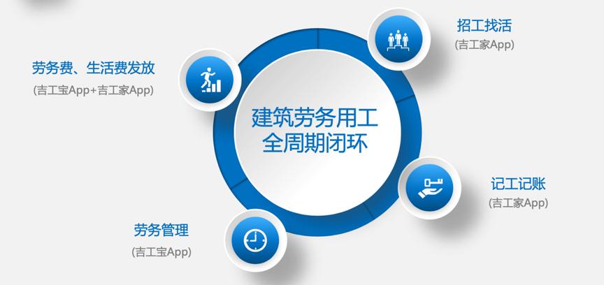 在劳务管理环节,吉工宝APP是吉工家旗下向建筑企业和项目的工程劳务用工管理平台。在管理工人模块,通过标签和评价功能形成工人档案。在项目管理模块,通过图片和文字向工人传达任务,实时监控项目动态;在线登记材料出入库记录。在项目报表模块,可查看各类出勤数据和项目管理统计数据。