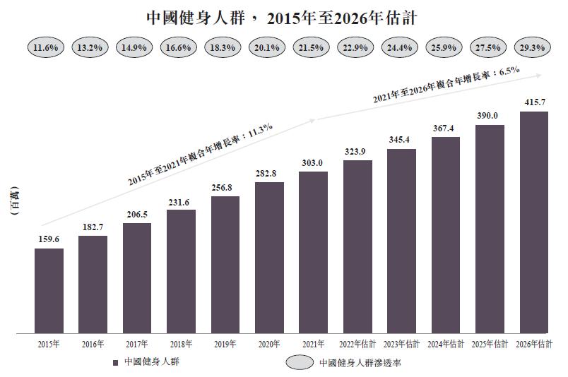图表5:中国健身人群规模及渗透率(2015-2026)