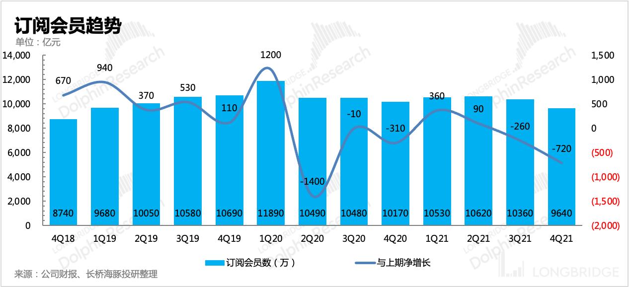 另外,通过比较历史数据,我们发现未剔除试用账号的每月订阅用户数与剔除了试用账号的每日订阅用户数,二者差异更小(+-20 万),因此为了观察变动趋势,暂且视为同一指标,待未来更多的历史数据披露后再更换。