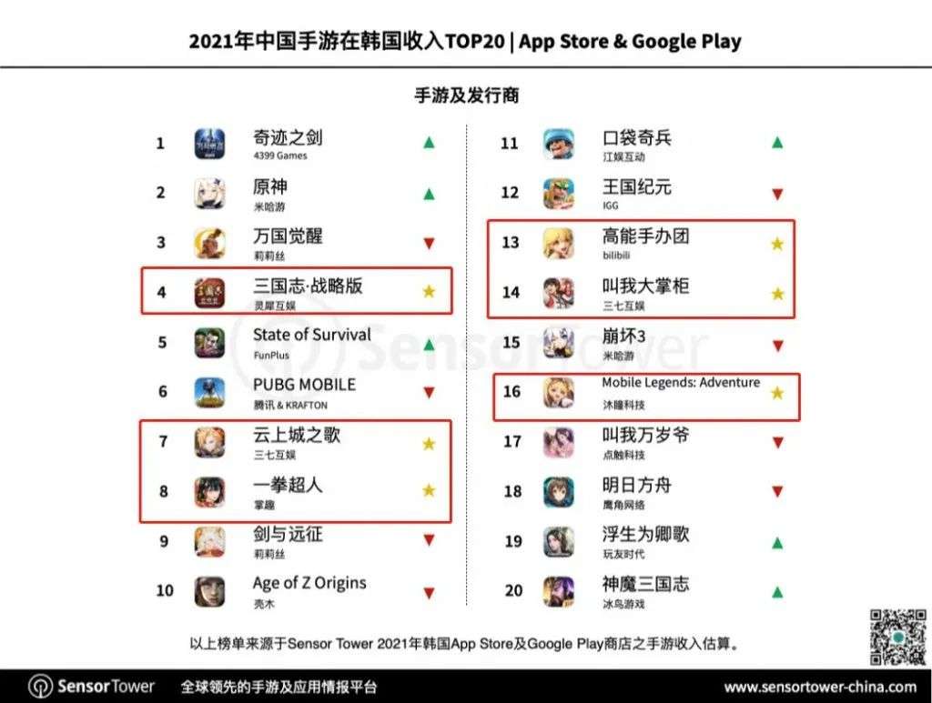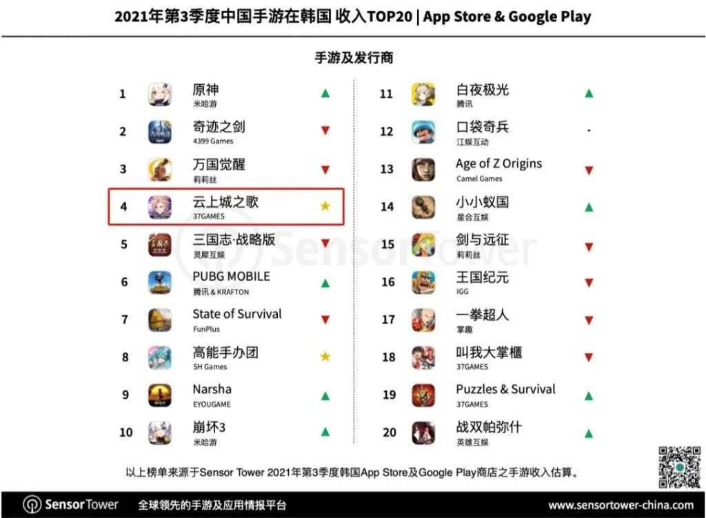 同样在2021年新登陆韩国市场的三七互娱的《云上城之歌》在中国手游韩国收入榜上排名第7,下载榜排名第12。