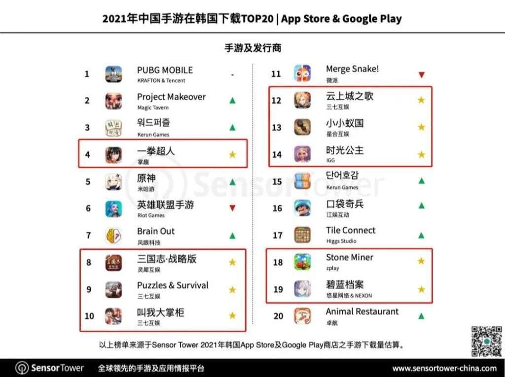 2021年的中国手游韩国收入榜上共有6款新国产手游上榜,而在下载榜上,则共有9款新手游上榜,除了《一拳超人》《三国志·战略版》《Puzzle & Survival》《叫我大掌柜》《云上城之歌》外,还有星合互娱《小小蚁国》、IGG《时光公主》、zplay《Stone Miner》和悠星《碧蓝档案》。