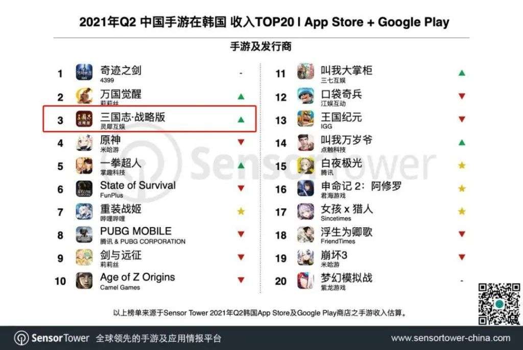作为去年2月才登陆韩服的新游,《三国志·战略版》凭借一个多月的收入就一举拿下了2021年Q1中国手游韩国收入榜第7,成为了另一款在韩国市场大获成功的国产SLG产品。