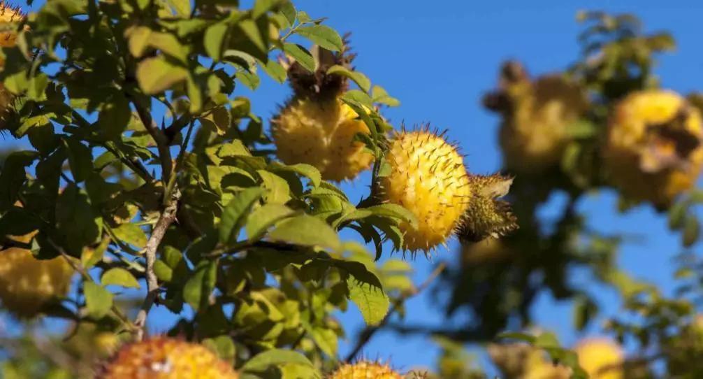 刺梨是缫丝花的果实,属蔷薇科,原产我国西南部,以贵州的刺梨最多最好。这种水果偏球形,外表有密刺,成熟时为黄色。