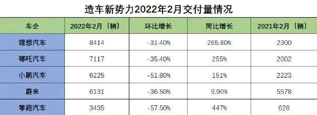 根据官方数据,2022年2月,蔚来交付了6131辆,小鹏汽车为6225辆,理想汽车最高,达到8414辆。