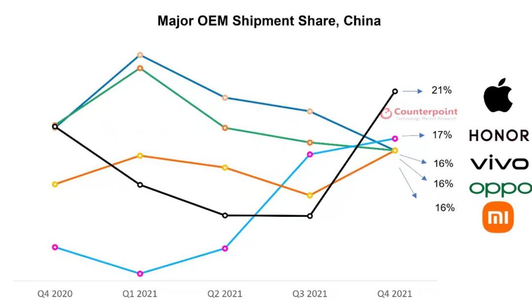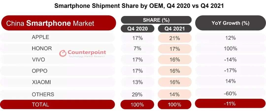 据Counterpoint,2021年第四季度,中国智能手机出货量同比下降11%。而荣耀回归后,市场份额较去年同期的7%暴增至17%,排名首次升至第二,位列安卓阵营榜首。该机构分析师称,“荣耀与苹果的表现改变了竞争格局”。