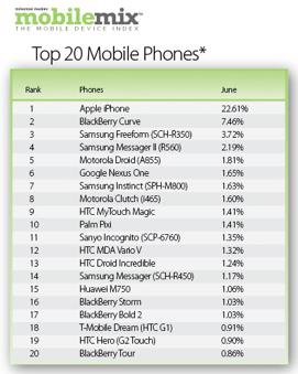 Android手机占据了六月展示量前20手机中的6部。Motorola Droid进入到了前五,HTC Droid Incredible排在第13。Millennial网络中前20的手机有13部是智能手机,占据六月全部展示量的43%。RIM凭借Curve占据了第二名,前20中有4部是RIM的手机。