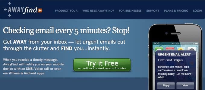 AwayFind就是这些创业公司中新的一员,他们的服务在今年早些时候就上线了。你可以使用它创建过滤器,识别你收件箱中最重要的邮件——包括从同事、家人等处发来的邮件。当收到这些重要的邮件时,AwayFind可以通过短信、电话(可以读出邮件内容)或者IM聊天工具提醒你。