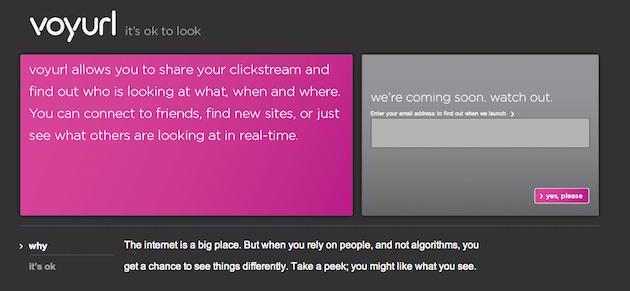 Voyurl的新网站,该网站目前尚未正式上线。顾名思义,它背后的理念是让你可以看到其他人正在网络上浏览什么(并使你的点击流可见)。这听起令人毛骨悚然。这就像