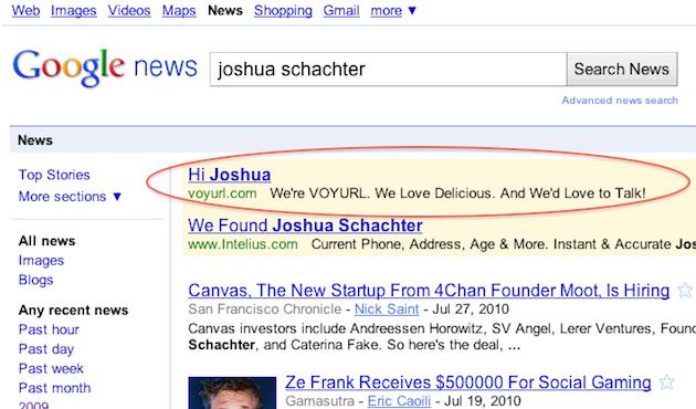 Joshua Schachter今晚指出的,Voyurl有一种吸引潜在投资者注意的很好方式:购买针对天使投资者的谷歌广告。“ 嗯,这是一种吸引潜在投资者关注的方式。我感到印象深刻,或者说毛骨悚然。“